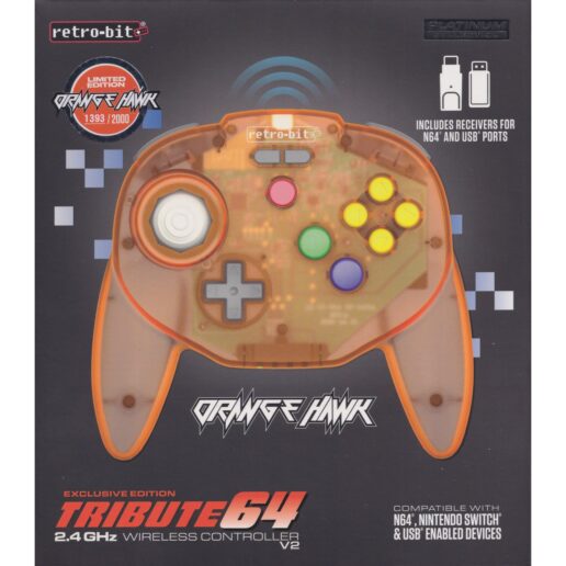 Tribute64 2.4GHz trådlös handkontroll är en del av Retro-Bits Platinum-serie av handkontroller dedikerade till klassiska retro-spelkonsoler. Den är designad för användning på N64 och USB-aktiverade enheter och erbjuder ultimat mångsidighet för alla spelgenrer. Byggd med en analog spak av högsta kvalitet, en bred och ergonomisk design för att förbättra din spelupplevelse och en generös knapplayout med ytterligare funktioner för USB-enheter, kommer spelarna att njuta av många timmar av klassiskt retro-spelande. Inbyggt rumble-funktion och minneskortsport ger dig uppleva uppslukande trådlöst spelande direkt till hands!
