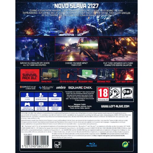 Left Alive Day One Edition är ett actionöverlevnadsspel utvecklat av Ilinx och utgivet av Square Enix till Playstation 4. Spelet släpptes 2019. I Left Alive tar spelaren rollen som olika överlevare i en krigshärjad stad. Spelet kombinerar stealth, strategisk strid och överlevnadselement när spelaren måste navigera genom farliga situationer och bekämpa fientliga styrkor för att överleva. Day One Edition inkluderar extra digitalt innehåll, såsom vapen och karaktärsdesigner. Spelaren måste fatta svåra beslut och använda sina resurser smart för att överleva i den dystopiska världen i Left Alive.